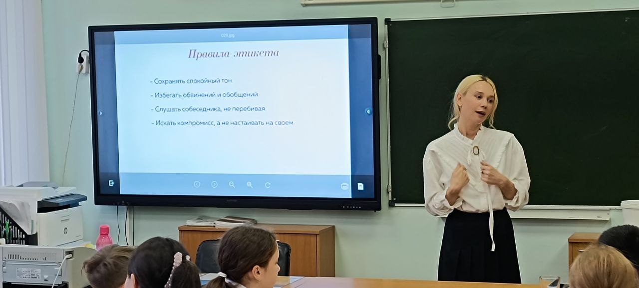 23 октября для учащихся 6 А, 7 А и 7 Б классов состоялся необычный открытый урок по этикету. Его провела эксперт по этикету и дресс-коду, победитель премии НАДЭП "Лучший специалист по этикету" Никонова Алена Александровна. Учащиеся узнали много интересного об истории этикета, о правилах поведения в современном обществе, попробовали применить знания на практике. Благодарим Алену Александровну за интересную подачу материала и мудрые советы для подростков!