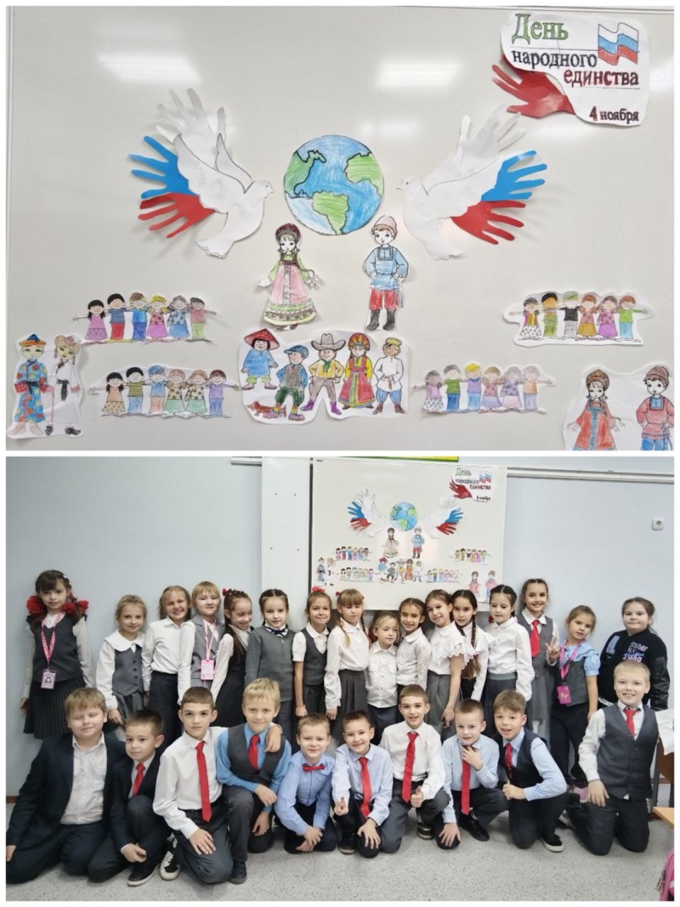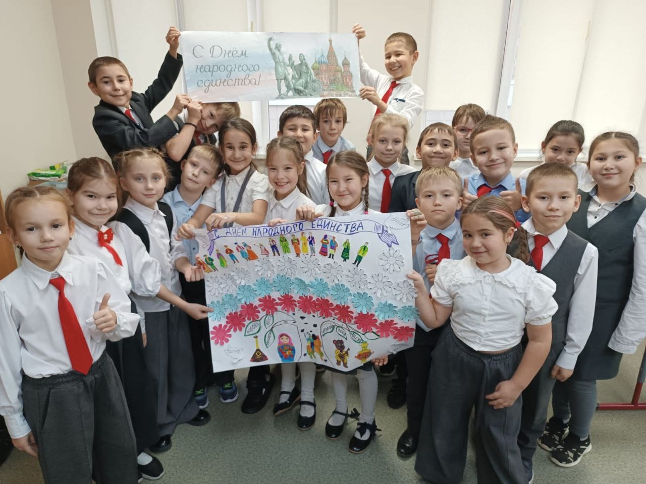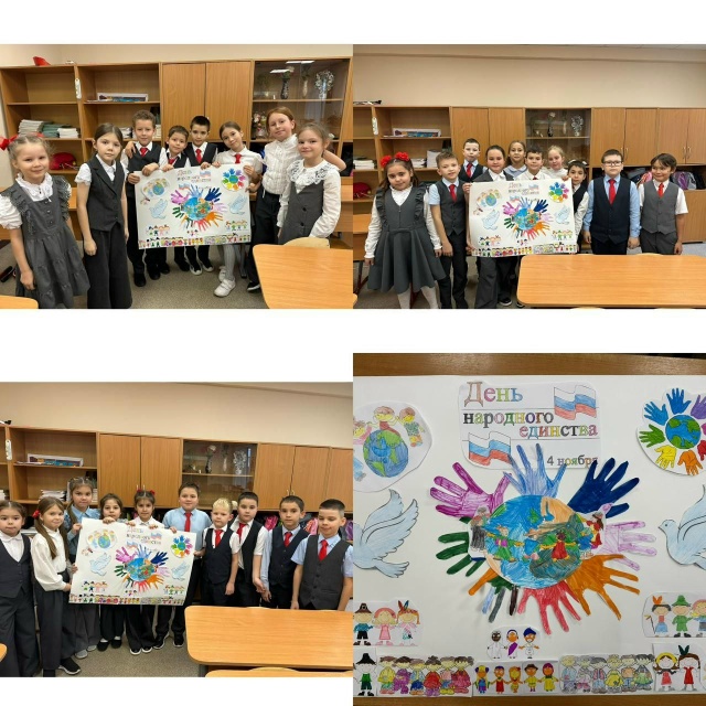 В преддверии праздника Дня народного единства учащиеся 2 А, 2 В, 2 Г классов выполнили коллективные творческие работы. Ребята познакомились с историей этого важного праздника, о значении единства и сплоченности. Такое совместное творчество не только развивает у детей чувство патриотизма и уважение к историческому прошлому страны, но и способствует формированию любознательности, умение слушать друг друга, работать в команде и радоваться достижениям, полученным в результате совместной деятельности. Работы детей стали символами дружбы и единства, а также напоминанием о том, чтобы мы жили в мире и согласии!