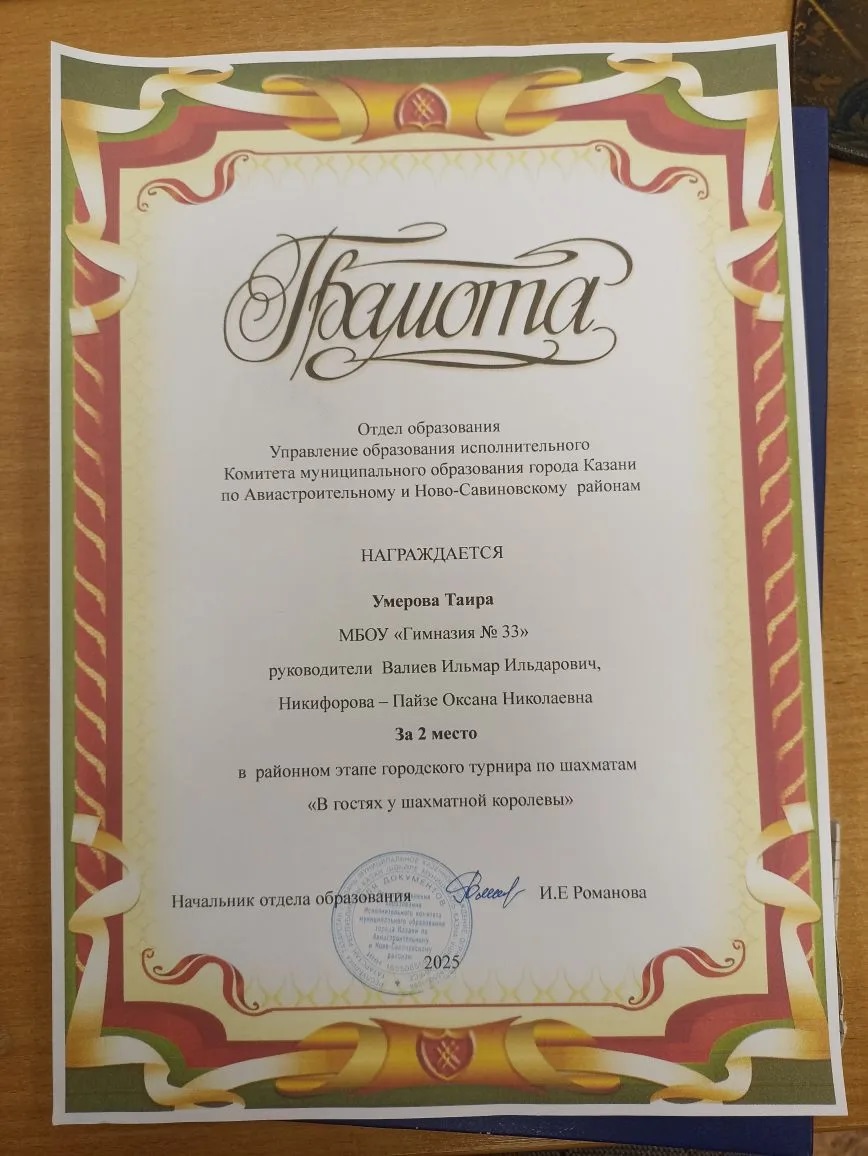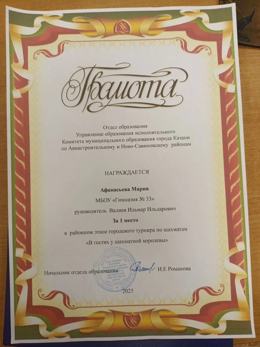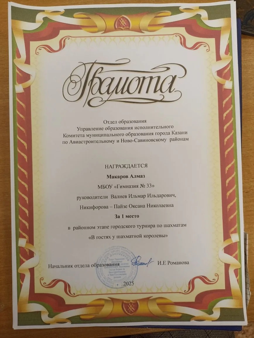 Поздравляем наших шахматистов и их наставников Валиева И.И., Никифорову-Пайзе О.Н. с блестящим выступлением на районном этапе турнира «В гостях у шахматной королевы»: Афанасьеву Марию, Макарова Алмаза - 1 место, Умерову Таиру - 2 место, Баязитова Рамзана - 3 место. Желаем команде не останавливаться на достигнутом, покорить и городской этап соревнований. Пусть ваша логика, хладнокровие и стратегия приведут к новой победе!