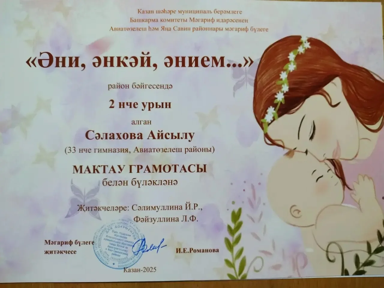 Гимназия №33 г. Казани → Достижения учащихсяРайонный этап городского конкурса "Әни, әнкәй, әнием"Поздравляем прекрасную семью Салаховых из 4 Г класса. Они заняли 2 место в районном этапе городского конкурса "Әни, әнкәй, әнием".Огромная благодарность педагогам Файзуллиной Л.Ф. и Салимуллиной Ю.Р. за подготовку семьи к конкурсу! Просмотров страницы: 8