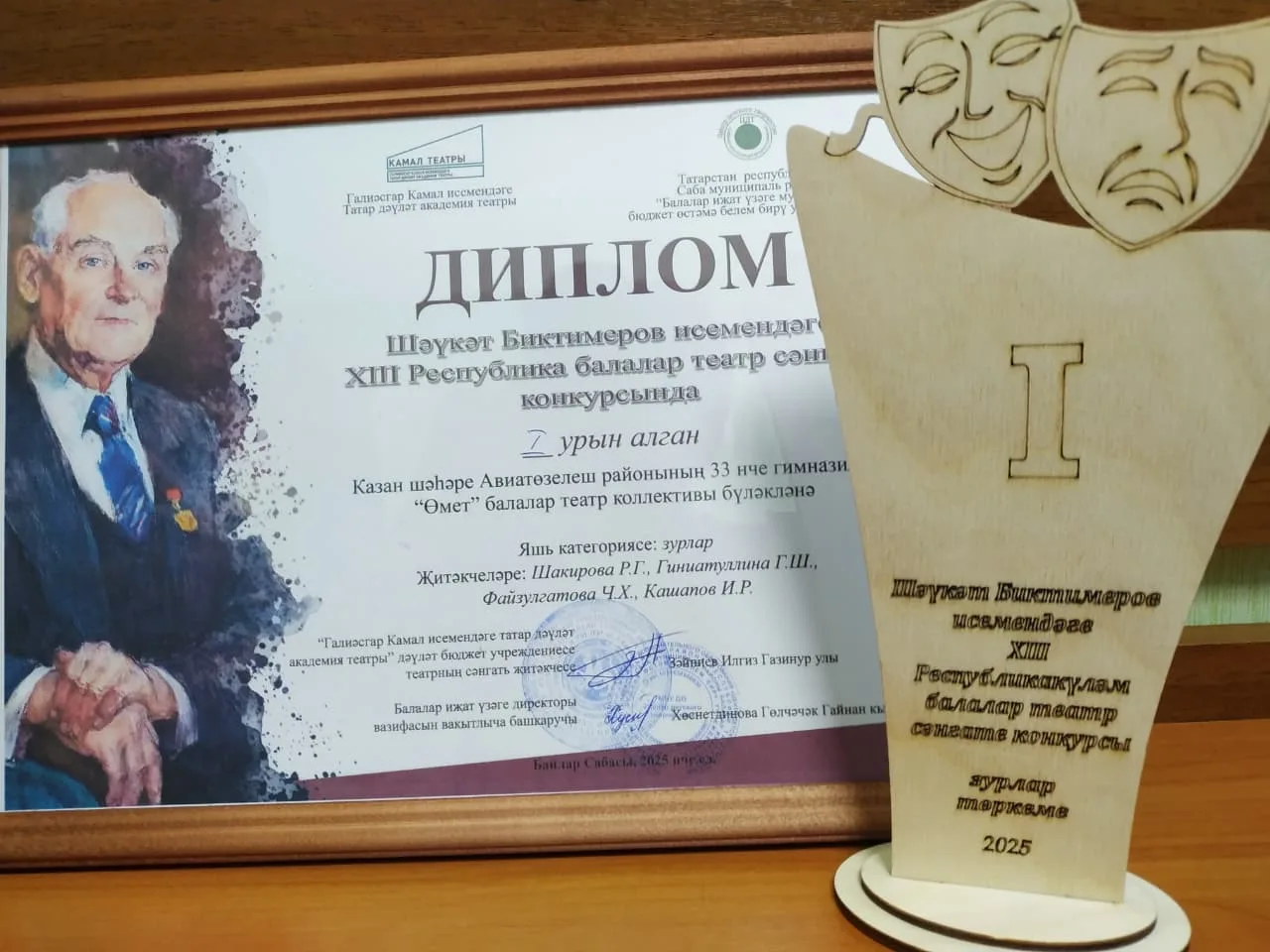 Гимназия №33 г. Казани → Достижения учащихсяРеспубликанский конкурс-фестиваль детского театрального искусства имени Шауката БиктимероваЕсть имена, которые становятся путеводной звездой для целых поколений. Для мира татарского театра таким именем стал Шаукат Биктимеров — актер, всей душой преданный сцене, создавший незабываемые образы.Центр детского творчества Сабинского района совместно с Государственным академическим театром имени Г. Камала ежегодно проводит республиканский конкурс-фестиваль детского театрального искусства имени Шауката Биктимерова. Это не просто соревнование. Это — возможность для школьников прикоснуться к миру высокого искусства, почувствовать магию сцены и раскрыть в себе новые грани таланта. Для театрального коллектива «Өмет» гимназии №33 участие в данном конкурсе стало традицией на протяжении трех лет. Фестиваль в этом году проводился в 13-й раз. Всего на конкурс поступило 28 работ от театральных коллективов школы. Из них 11 выступлений были отобраны в финал. По положению конкурса учащиеся начальных классов должны были представить сказки, учащиеся средних классов - отрывок из произведения Туфана Миннуллина, старшеклассники - спектакль по роли Шауката Биктимирова. Учащиеся МБОУ "Гимназия № 33" заняли 1 место, представив спектакль "Альмандар из деревни Альдермеш». Также Саттаров Дамир (8 И), исполнивший роль Альмандара, стал победителем в номинации "Лучшая мужская роль". Выступления оценивало авторитетное жюри во главе с народной артисткой Татарстана Фаридой Сафиной. От всей души поздравляем театральный коллектив гимназии и их руководителей с этой победой! Гордимся! Благодарим организаторов фестиваля - Сабинский муниципальный район! Просмотров страницы: 4