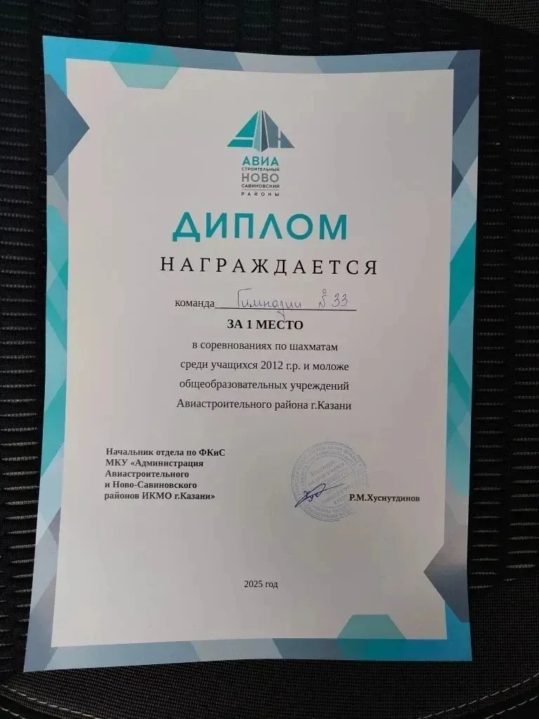 Гимназия №33 г. Казани → Достижения учащихсяРайонный этап соревнований по шахматамКоманда наших юных шахматистов блестяще выступила на районном этапе соревнований по шахматам среди учащихся 2012 года рождения и младше. Ребята заняли 1 место!Поздравляем наших гроссмейстеров и их тренеров с блестящей победой! Желаем им сохранить чемпионский настрой и победить на городском этапе! Вперед к новым вершинам! Просмотров страницы: 4