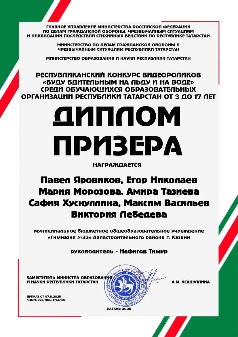 Поздравляем педагога дополнительного образования Нафигова Тимура Шаумяновича и его команду ребят, которые стали призерами республиканского конкурса видеороликов "Будь бдительным на льду и на воде" среду обучающихся образовательных организаций Республики Татарстан от 3 до 17 лет. Молодцы! Желаем дальнейших успехов!