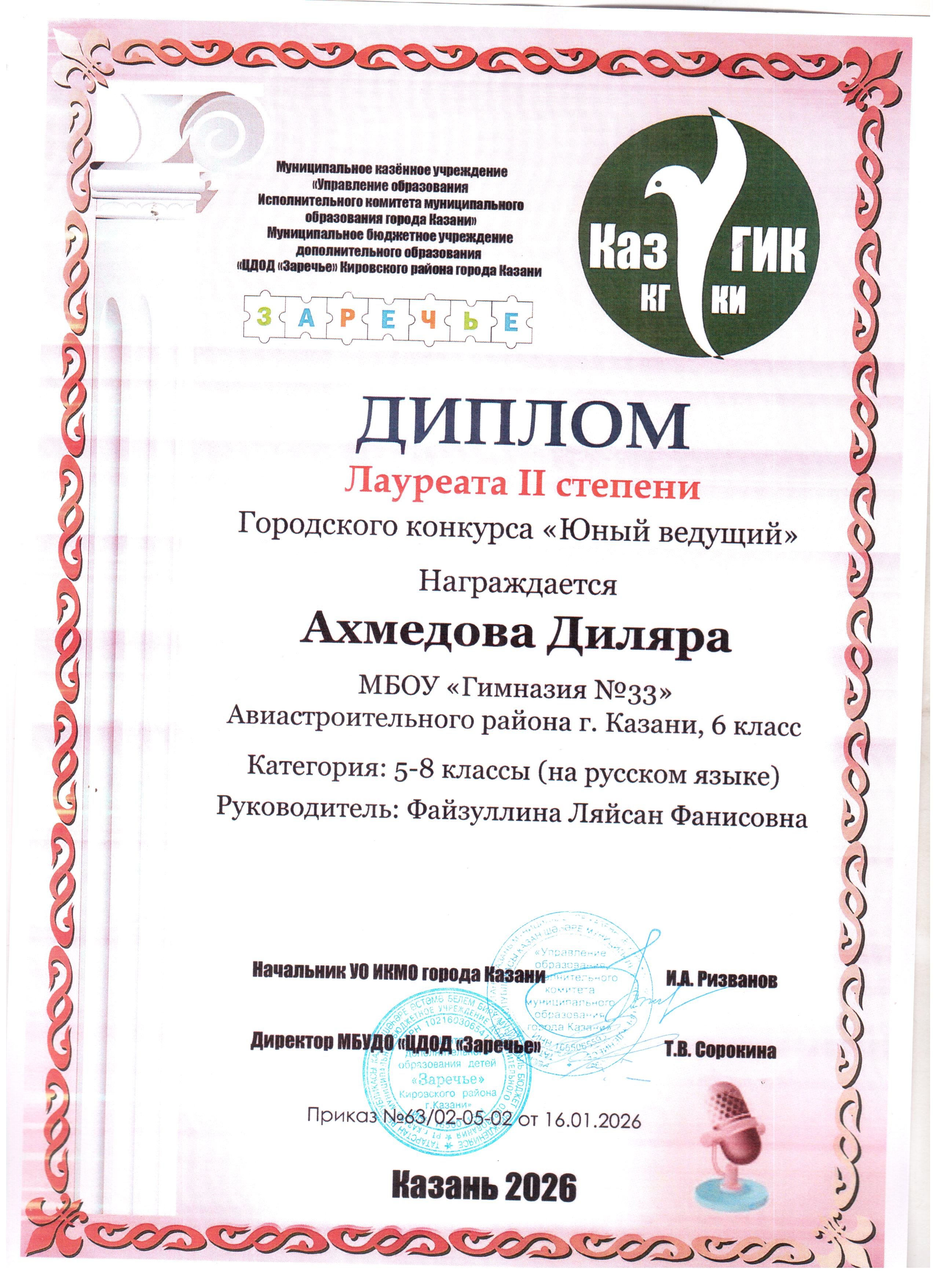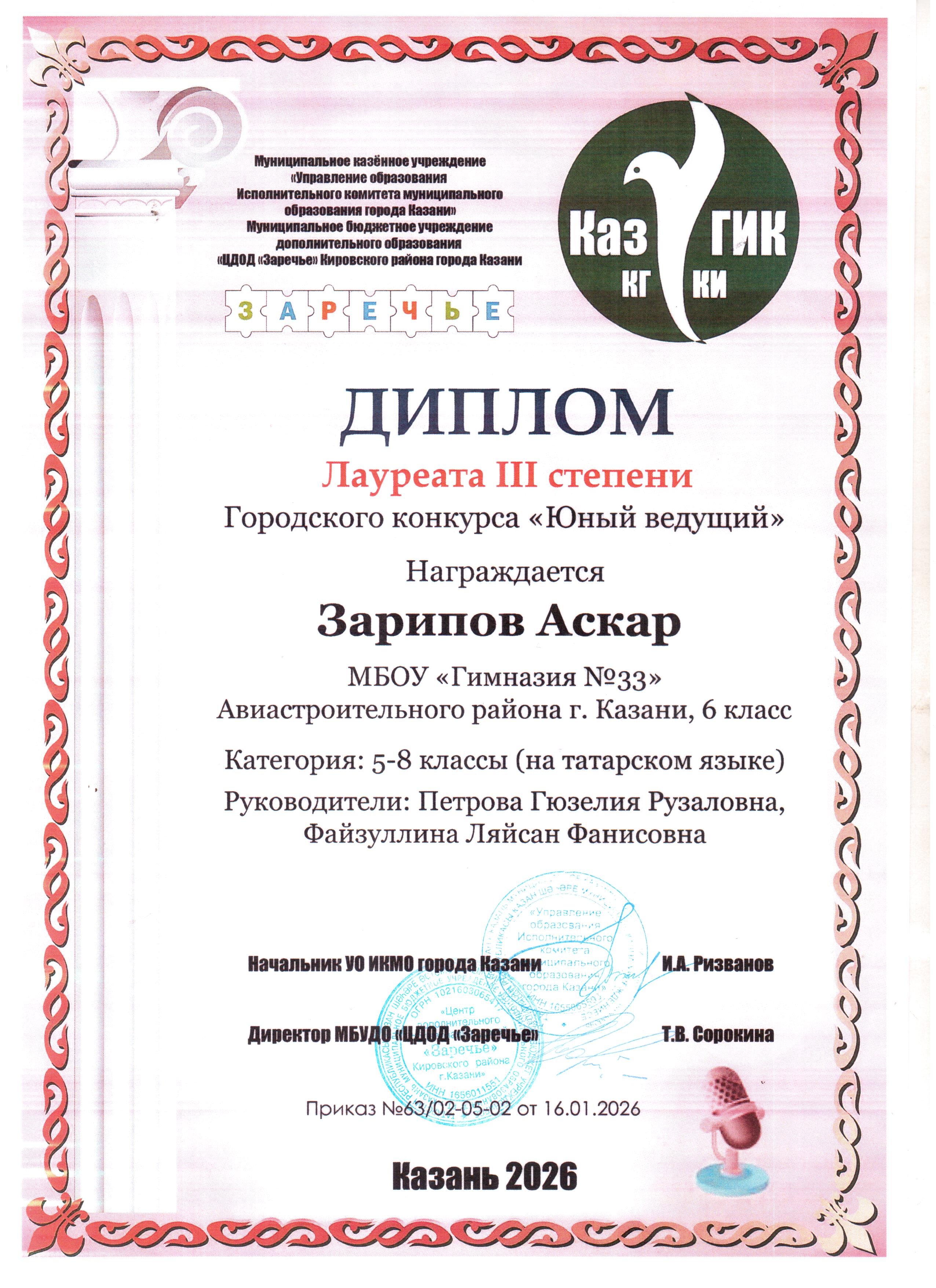 Гимназия №33 г. Казани → Достижения учащихсяГородской конкурс «Юный ведущий»Подведены итоги городского конкурса «Юный ведущий». Поздравляем учащихся 6 А класса:Лауреат 2 степени (на русском языке) - Ахмедова Диляра, Лауреат 3 степени (на татарском языке) - Зарипов Аскар. Благодарим учителей родных языков Петрову Г.Р, Файзуллину Л.Ф. Желаем новых побед! Просмотров страницы: 7