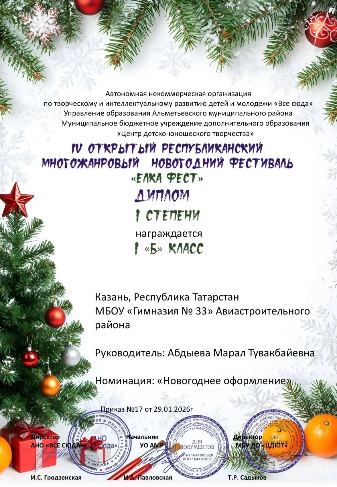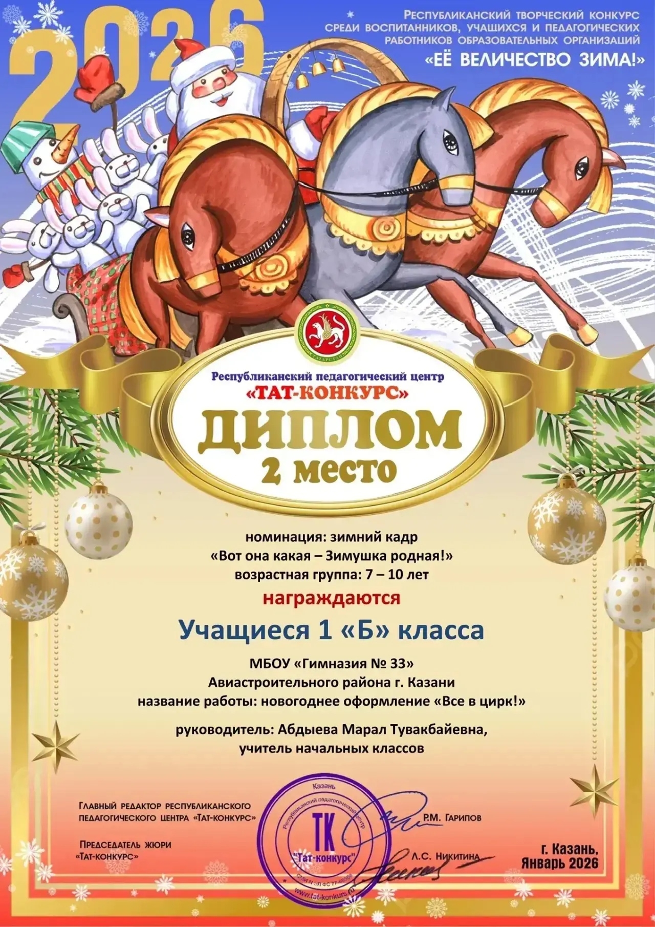 Гимназия №33 г. Казани → Достижения учащихсяТворческий успех 1 Б классаВ декабре, в преддверии Нового года, учащиеся 1 Б класса вместе с родителями и классным руководителем Абдыевой М.Т. оформили свой кабинет в стиле «Цирк».Творческий подход и усердие ребят были высоко оценены на республиканских конкурсах: в конкурсе «Ёлка фест» они заняли 1 место; в конкурсе «Вот она какая — Зимушка родная» — 2 место. В январе состоялось вручение заслуженных дипломов. Это событие стало прекрасным завершением праздничного сезона и подарило детям множество радостных эмоций. Поздравляем юных творцов и их классного руководителя с отличными результатами! Просмотров страницы: 9