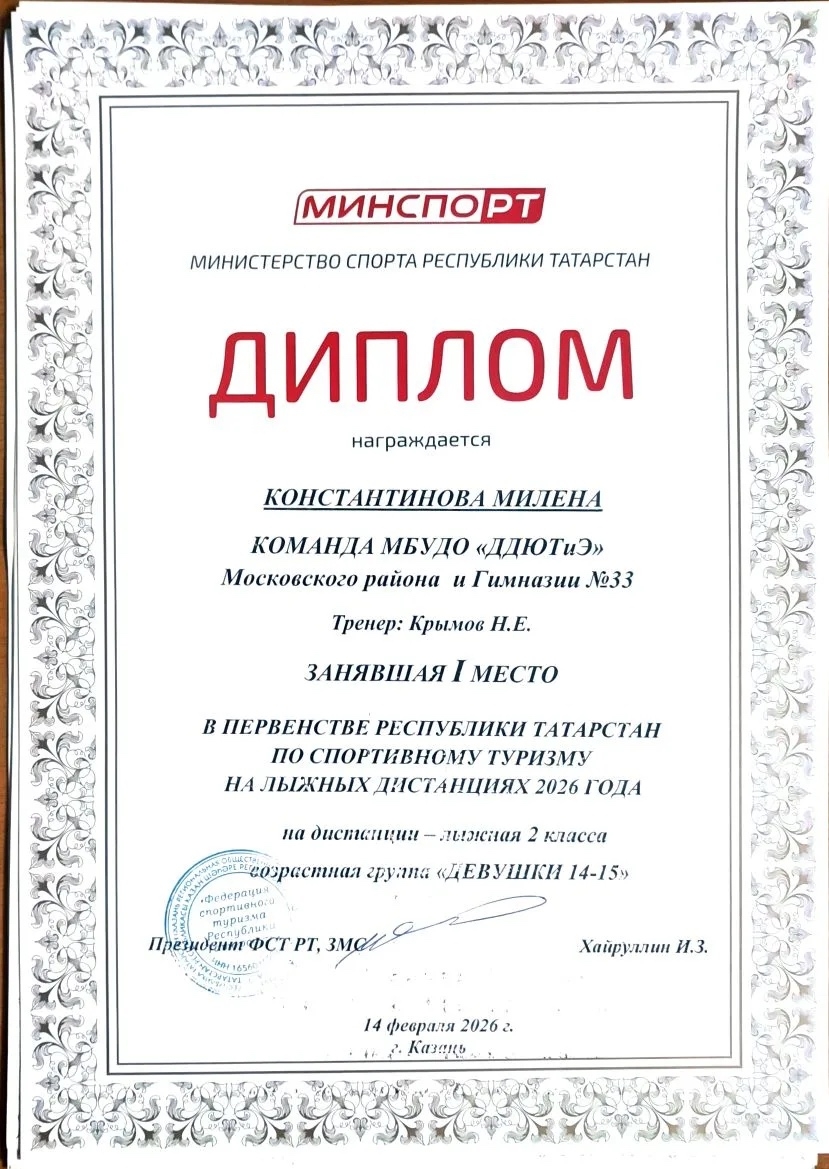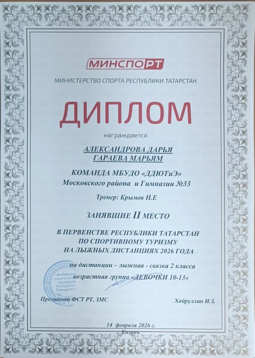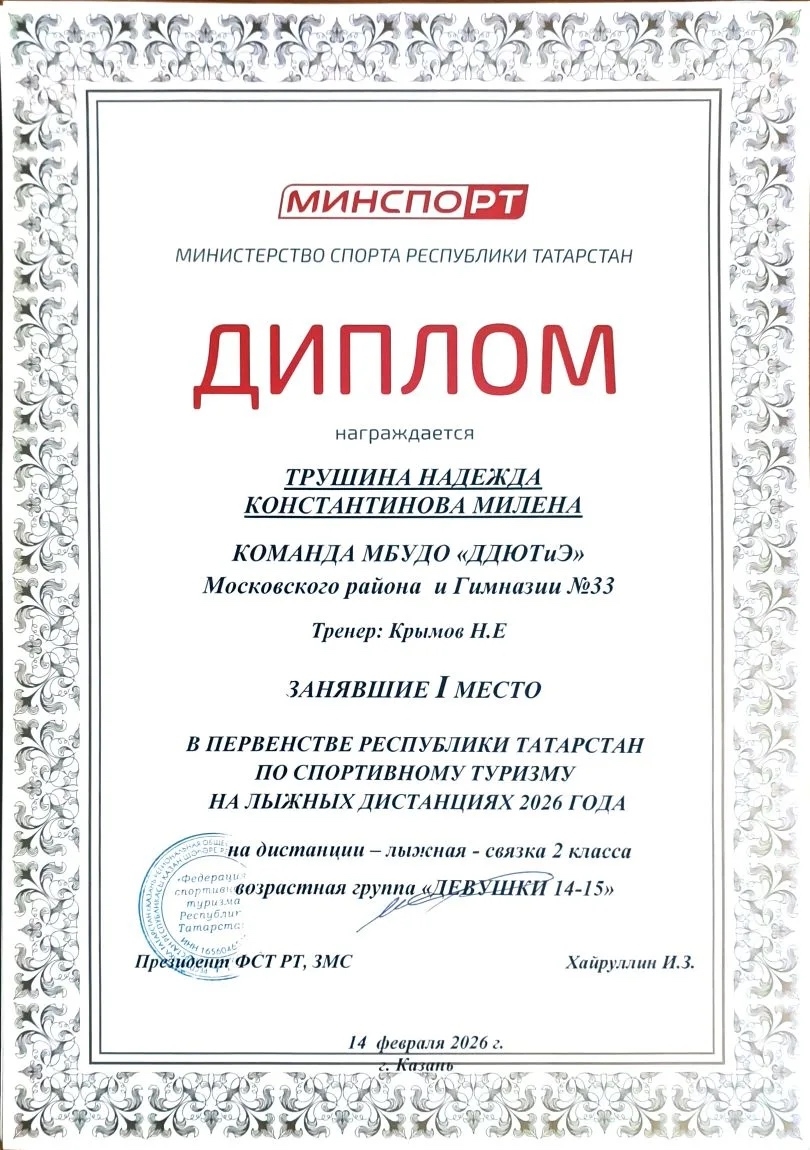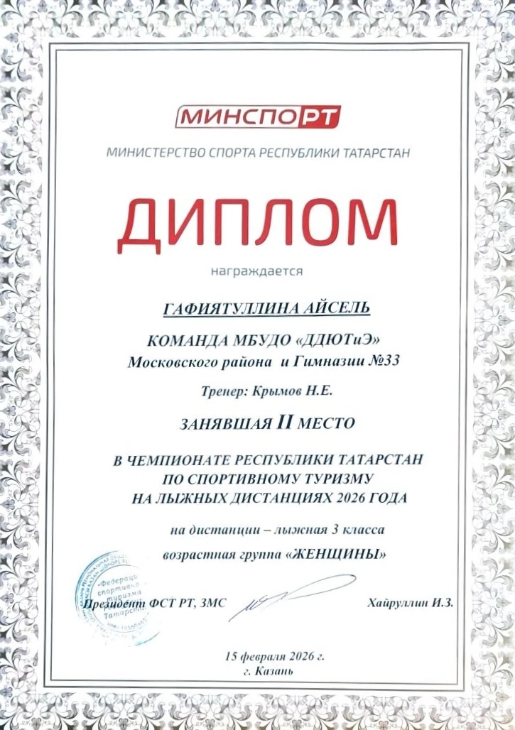 Поздравляем нашу команду по спортивному туризму и тренера Крымова Н.Е. с отличным выступлением на первенстве Республики Татарстан по лыжному туризму! Ребята заняли 1, 2 и 3 места. В составе команды: Александрова Дарья (6И), Гараева Марьям (6И), Константинова Милена (7Л), Трушина Надежда (7Л), Гафиятуллина Айсель (10Б). Гордимся нашими спортсменами! Желаем новых побед и ярких достижений! Так держать!