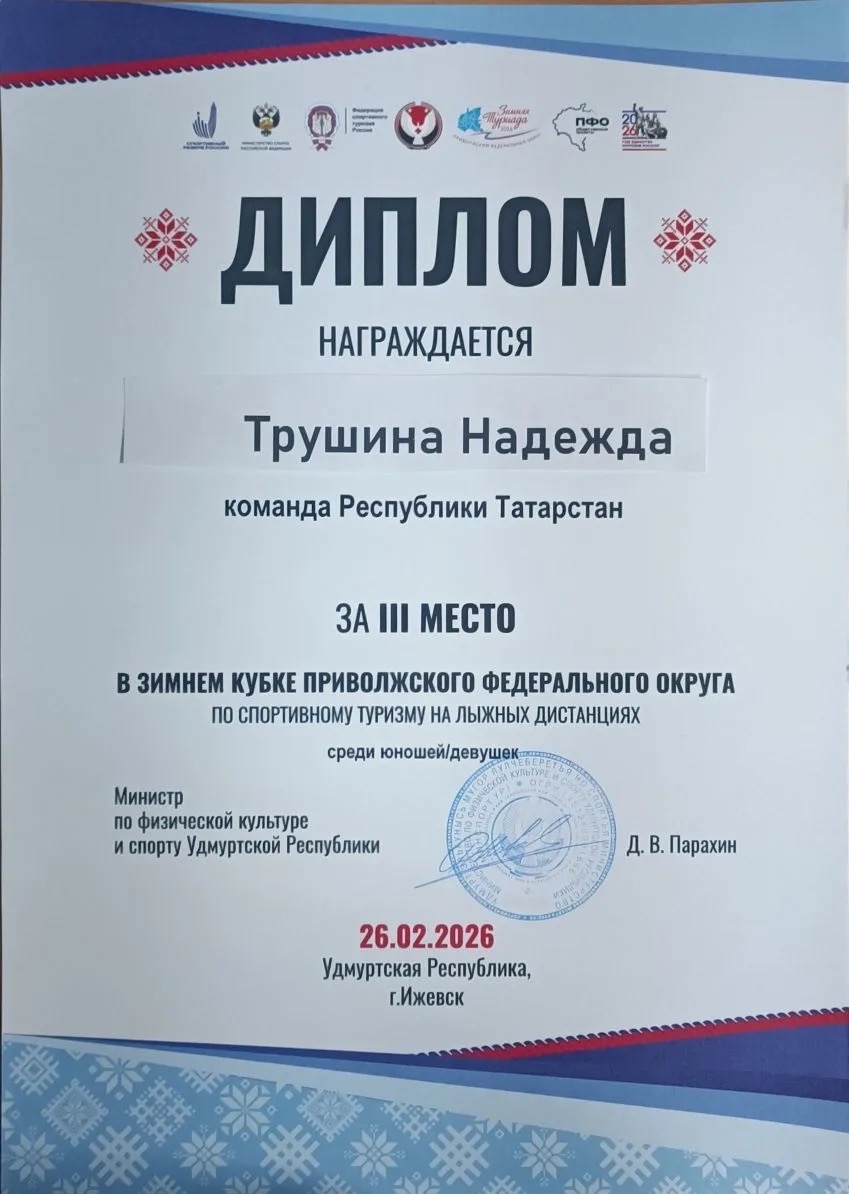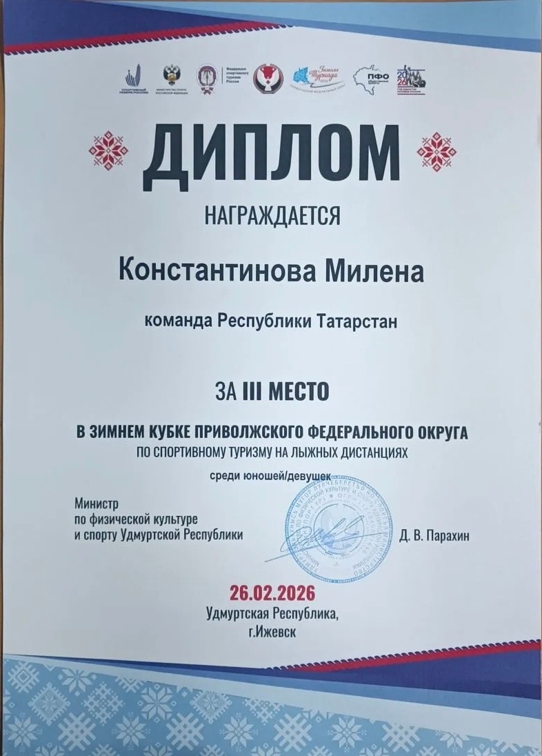 С гордостью сообщаем о блестящем успехе наших учащихся! Воспитанницы тренера Н.Е. Крымова - Константинова Милена (7Л) и Трушина Надежда (7Л) достойно представили республику на Зимнем кубке Приволжского федерального округа по спортивному туризму на лыжных дистанциях. Наши ученицы вошли в состав сборной команды Республики Татарстан и завоевали 3 место! Это не просто победа, а результат долгих и упорных тренировок. Милена и Надежда занимаются туризмом уже много лет и сегодня вышли на высочайший уровень мастерства! От всей души поздравляем спортсменок и их тренера. Вы — наша гордость и пример для подражания!