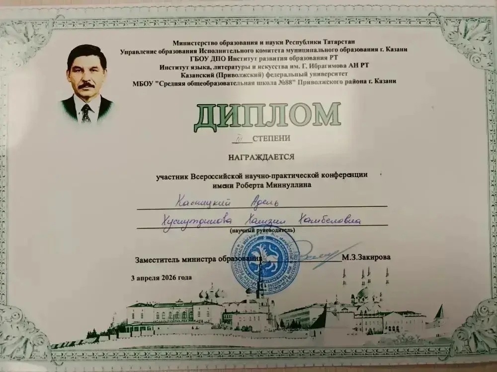 Гимназия №33 г. Казани → Достижения учащихсяПобеда на Всероссийской конференции имени Роберта МиннуллинаПоздравляем Аделя Касницкого (2И), занявшего 3 место на Всероссийской научно-практической конференции имени Роберта Миннуллина! Выражаем благодарность Х.Х. Хуснутдиновой за подготовку, поддержку и веру в ученика. Желаем Аделю новых блестящих побед, вдохновения и удачи на пути к большим достижениям!Просмотров страницы: 3