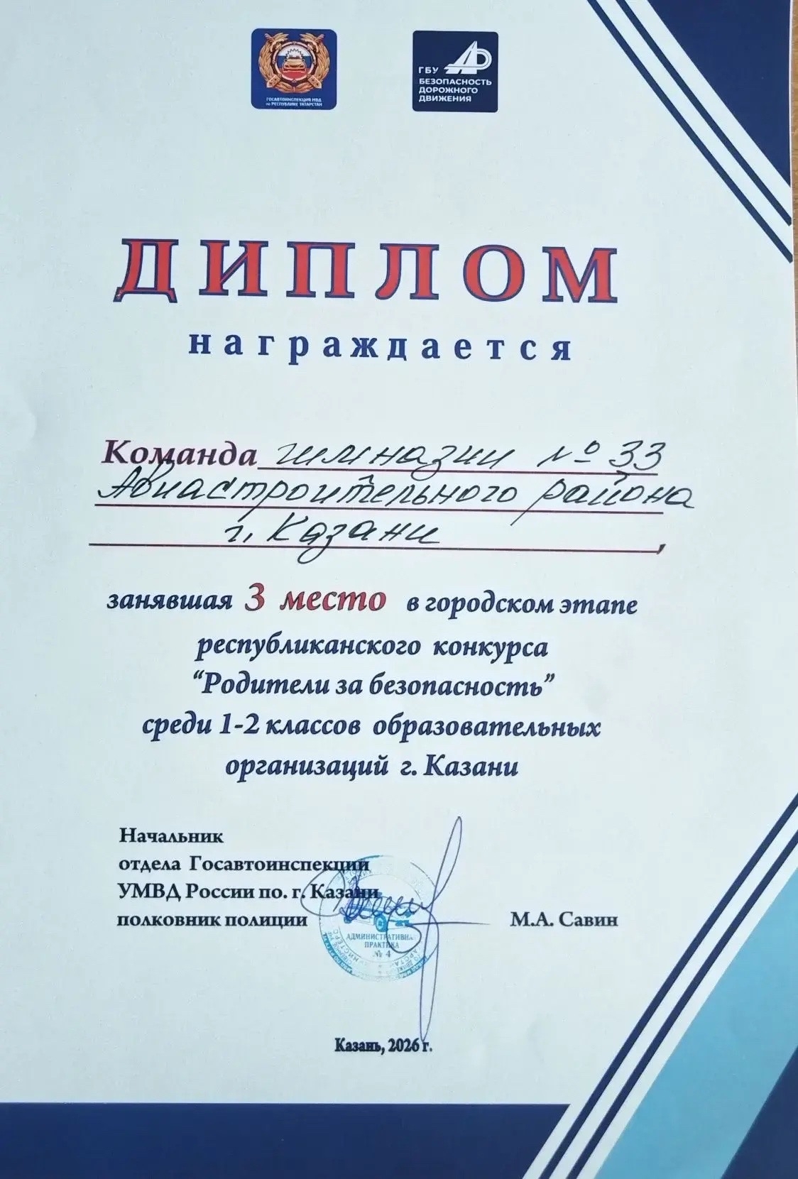 Гимназия №33 г. Казани → Новости классовУспех на конкурсе «Родители за безопасность»Поздравляем команду родителей и учащихся 2В класса (Классный руководитель - О.Н. Никифорова-Пайзе) с 3 местом в городском этапе республиканского конкурса «Родители за безопасность». Желаем удачи на республиканском этапе конкурса! Молодцы! Так держать!Просмотров страницы: 4