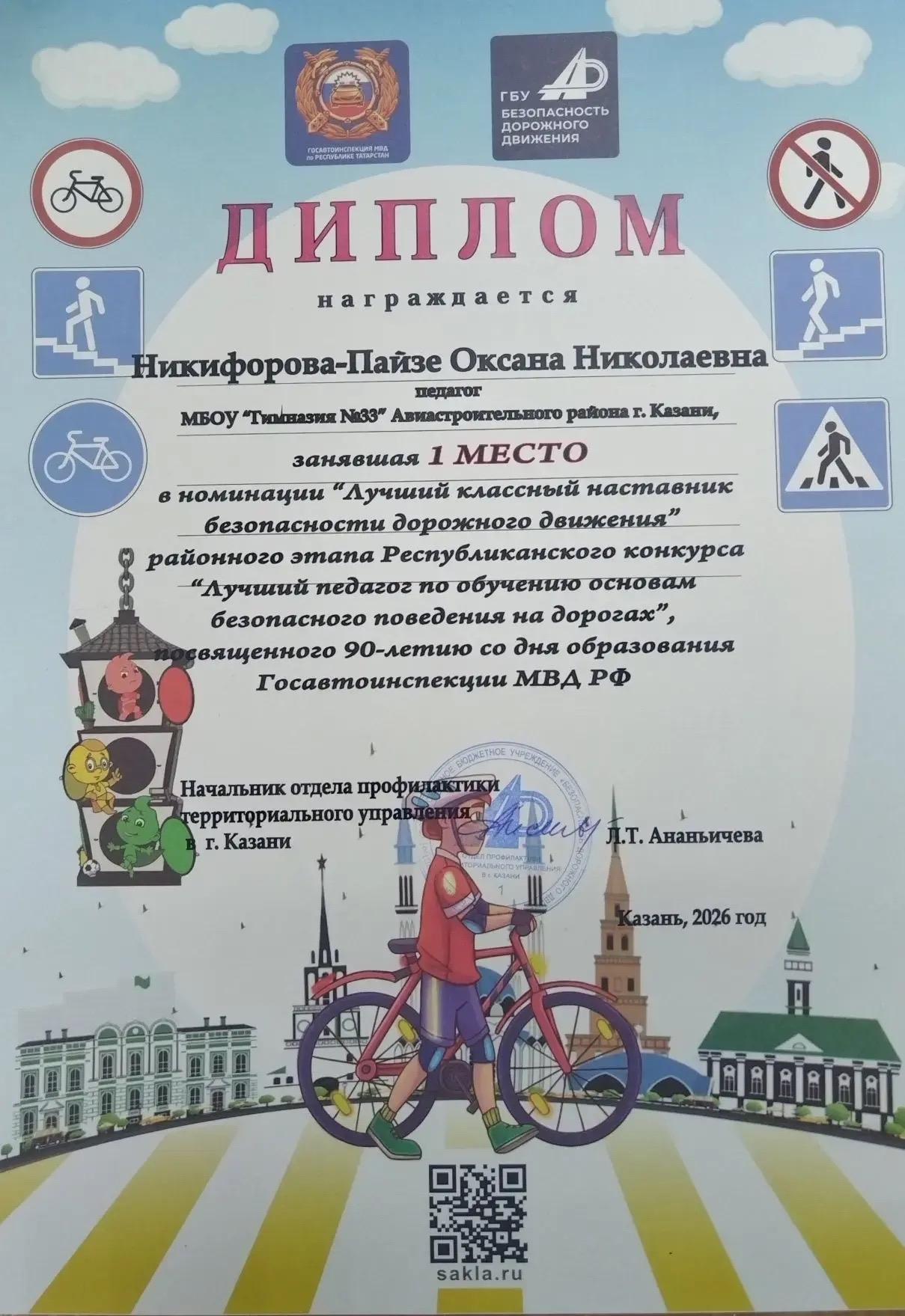 Поздравляем Оксану Николаевну Никифорову-Пайзе с заслуженной победой! Она заняла 1 место в номинации «Лучший классный наставник безопасности дорожного движения» на районном этапе Республиканского конкурса «Лучший педагог по обучению основам безопасного поведения на дорогах». Мероприятие было приурочено к 90-летию со дня образования Госавтоинспекции МВД РФ. Обучение детей правилам дорожного движения — задача первостепенной важности. Оксана Николаевна не просто объясняет эти нормы, а преподносит их так, что ребята усваивают материал на всю жизнь. Её уроки всегда увлекательны, наглядны и результативны, а методика отличается чуткостью и новаторством. Спасибо вам за труд, профессионализм и заботу о безопасности наших учеников! Желаем новых достижений, сил, вдохновения и благодарных воспитанников.