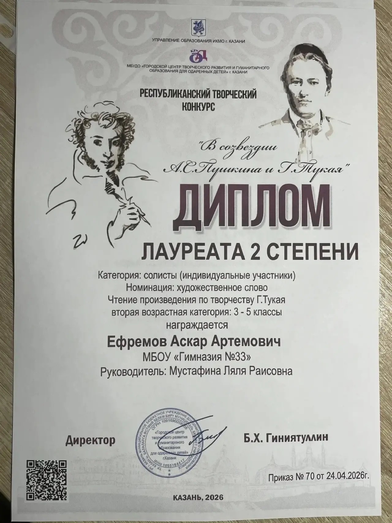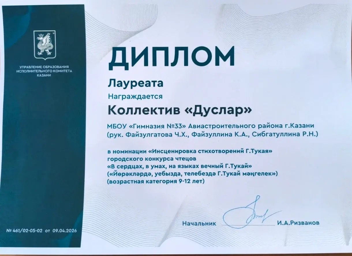 Гимназия №33 г. Казани → Достижения учащихсяЗвезды неделиЭта неделя выдалась для наших учеников насыщенной и щедрой на победы. Спешим поделиться главными новостями:Магдеева Зарина (6Б) — 2 место во Всероссийском конкурсе молодых писателей «Илһам». Руководители - учитель родного языка Х.Х. Хуснутдинова и руководитель кружка «Юный журналист» Л.Ф. Файзуллина. Садыков Камиль (10И) — 2 место в XVI Всероссийском конкурсе чтецов имени Габдуллы Тукая. Руководители — Ч.Х. Файзулгатова и Р.Г. Шакирова. Хитина Дарья (3Б) — лауреат XVI Всероссийского конкурса чтецов имени Габдуллы Тукая. Руководители — А.Н. Тимерова и С.Д. Назарова. Дипломами лауреата городского конкурса чтецов «В сердцах, в умах, на языках вечный Г. Тукай» награждены коллектив «Дуслар» и Ефремов Аскар. Закиров Амир (5Б), Гарифуллин Булат (7И) и Казанцев Михаил (9И) стали призёрами финала республиканской олимпиады юных изобретателей «Кулибины XXI века»! Михаилу Казанцеву поступило предложение о совместной работе в лаборатории факультета фармацевтики как будущему абитуриенту. Руководитель — Э.Ж. Закирова. Ефремов Аскар - лауреат 2 степени в республиканском творческом конкурсе «В созвездии А.С. Пушкина и Г. Тукая». Руководитель - Л.Р. Мустафина. Поздравляем всех учащихся и желаем новых побед! Выражаем благодарность руководителям за подготовку ребят. Просмотров страницы: 6
